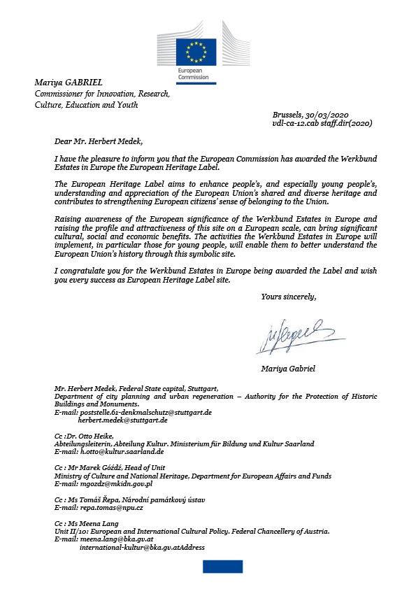 I congratulate you for the Werkbund Estates in Europe being awarded the Label and wish