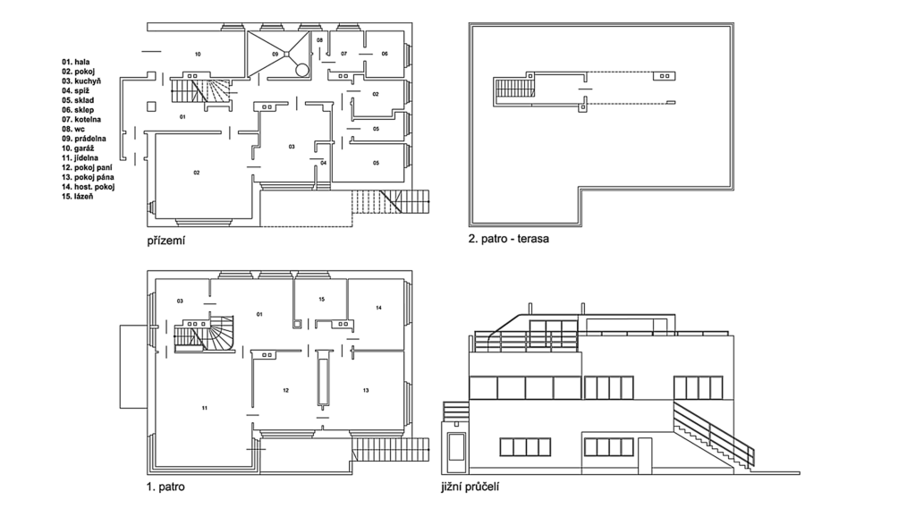 The public’s attention was already directed to the first house on the Baba estate, commissioned by František and Naděžda Munk and designed by the co-author of the Trade Fair Palace, Josef Fuchs, in cooperation with Munk’s nephew Otokar Fischel. The family’s living areas are atypically situated in a raised overhanging cube with enlarged sliding window panes forming a sliding strip. The terrace and hanging stairs connect the living floor with the garden.