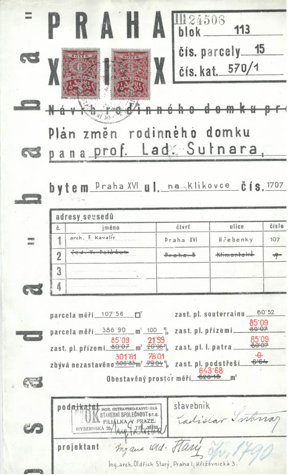 Oldřich Starý navrhl pro vynikajícího českého grafika a designéra Jaroslava Sutnara, jeho ženu Františku a dva syny minimalistický rodinný dům s ateliérem na jižní straně posazený na pilotech. Ateliér vedoucí přes jedno a půl podlaží byl opatřen galerií přístupnou lodním žebříkem a později rozšířen. Sala terrena u pilotů byla počátkem šedesátých let zasklena jako zimní zahrada.